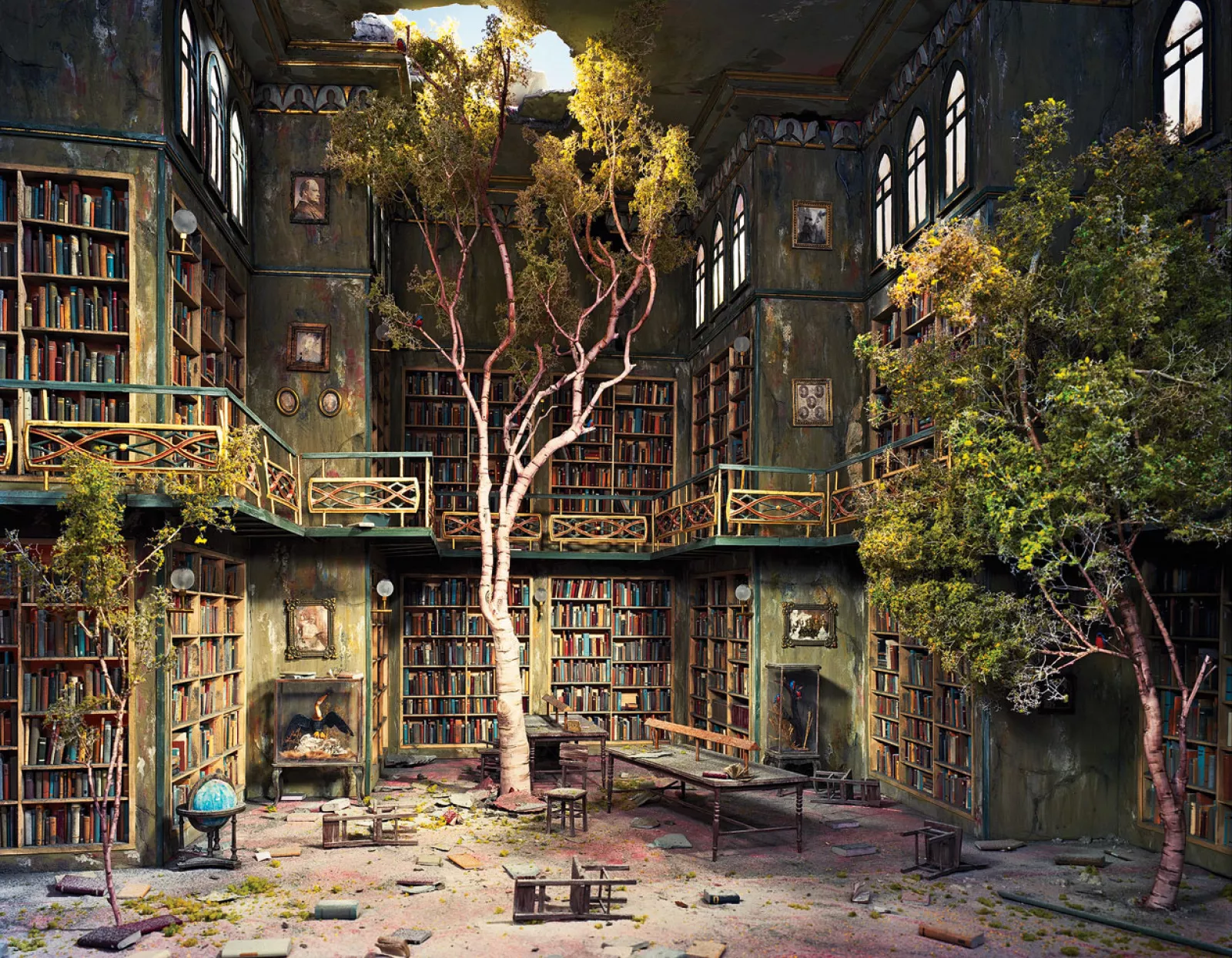 Library (2007) is Brooklyn artist Lori Nix's photograph of her ongoing scale-model diorama series "The City," set in an imagined posthuman future.