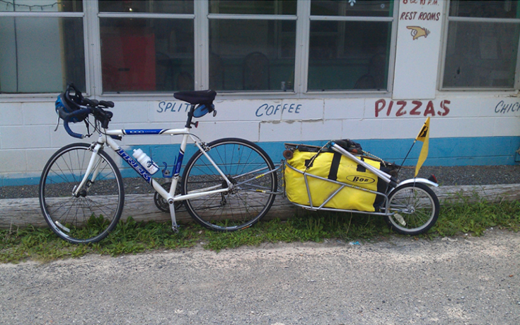 Ward’s rig, complete with the skateboard he used to navigate 500 miles of road walks in North Carolina.