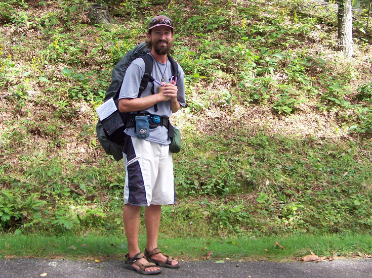 Ward poses along the Mountains-to-Sea Trail. He walked 1,300 miles in those Tevas.
