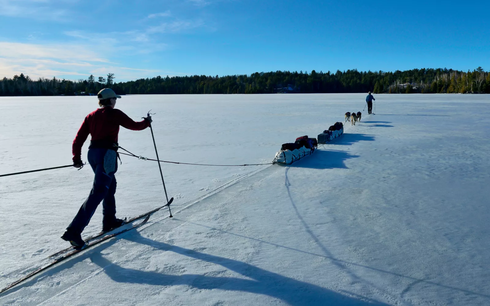 On a cold March morning, the frozen surface of Knife Lake mirrors the sky: wispy patches of snow in an endless icy blue. The sled dogs are fresh, barking and lunging into their harnesses. Oblivious to the beautiful day, all they want to do is pull. Tethered to a bruiser named Tank, I dig my skis into the crust to restrain him while my companions, Dave and Amy Freeman, wrangle dogs of their own. The instant I straighten my skis, Tank takes off with graceless exuberance, his tan hindquarters moving like an eggbeater as he claws for purchase on the half-frozen snow. Soon I am chattering behind at breakneck speed. It feels like flying.