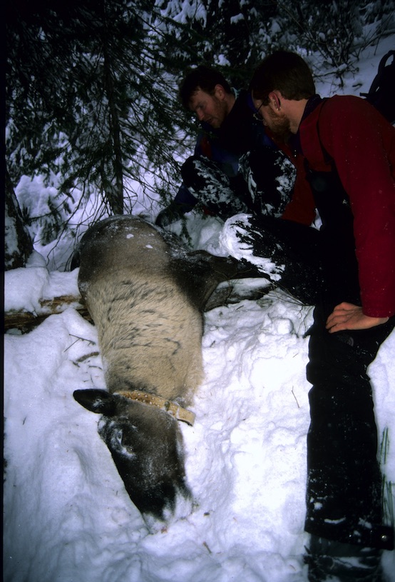 Field technician Cam Thompson beginning a necropsy on a collared South Purcell caribou likely killed by an avalanche in the early 2000s. Increased pressure from snowmobiles can force caribou from critical winter habitat into more-avalanche-prone areas, or into areas with lower-quality winter food.