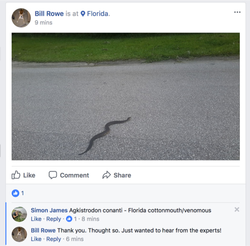 A greater problem than the snake trolls, though, is moderating snake experts who join the group to help the administrators with identifications but end up berating people who post photos of a snake they just killed. Kevin Messenger, one of the group’s administrators, says the goal is for the group to operate like an interactive field guide. “If a person had this dead snake and they opened up a book, the book isn’t going to yell back at them and say, ‘Oh what the hell, you shouldn’t kill it,’” he says. “It’s just going to tell you about that snake.”