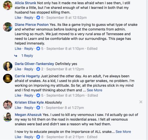 Still, it can be hard to be engaging over the internet with a stranger, compared with in-person conversation. “When I give a talk in person, I can almost guarantee, if there’s somebody out there who didn’t like snakes, I could usually convince them by the end of the day,” says Messenger. “Whereas here, on this group, you will run into people that are adamant.”