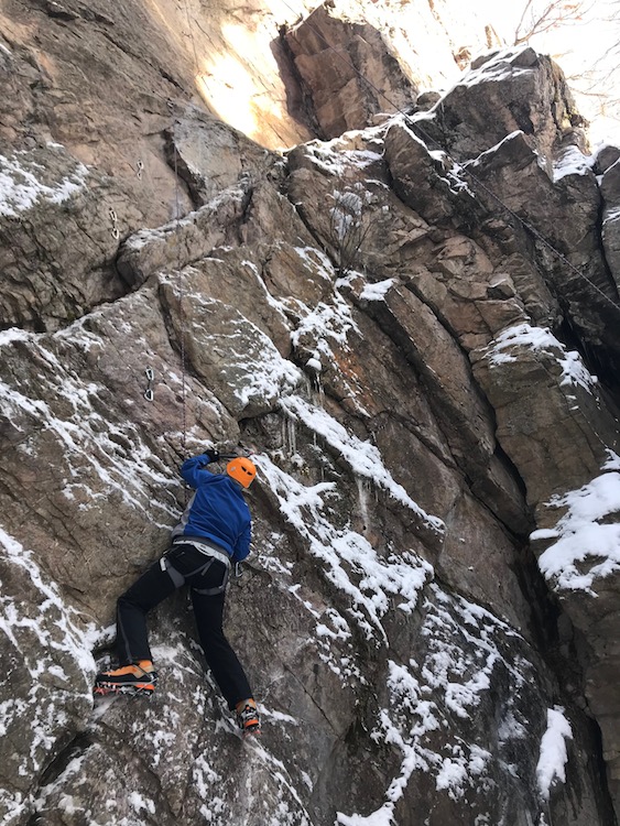 It’s almost 4 P.M., and the canyon is split through with shadow. Light slides across the frozen river and speckles our climb in small pockets of yellow.