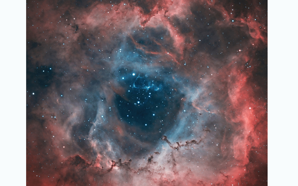 Another spectacular sight in the early winter skies is found in the constellation Monoceros, near Orion, the Hunter. Within the constellation is the beautiful Rosette Nebula, a huge gas cloud in whose contours earth-bound viewers see the shape of a rose—an enormous one that is 130 light-years across. But it can all be taken in through the lens of a telescope because of its great distance, some 1,500 years from Earth. Scientists have counted around 2,500 young stars emerging from its gaseous core. Those interested in seeking out the Rosette will need dark skies and a telescope and can find it roughly a palm’s length to the left of the bright-red star Betelgeuse, in Orion.