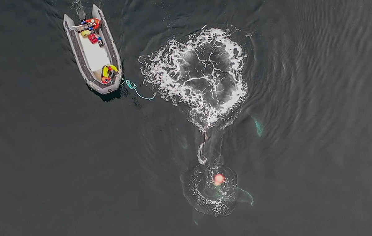 Under the Marine Mammal Protection Act, NOAA Fisheries’ Office of Protected Resources is charged with coordinating emergency response efforts to entangled and stranded marine mammals. But volunteer networks, operating under NOAA permits, are often the first to mobilize a rescue effort when a report of an entangled whale comes in. (In Canada, Fisheries and Oceans oversees response networks.) Using techniques borrowed from the whaling industry, a trained team approaches the entangled cetacean in a small inflatable boat, backed by one or two support vessels and land-based crew. But the rescuers must get close enough to evaluate the problem. And that’s where drones come in.