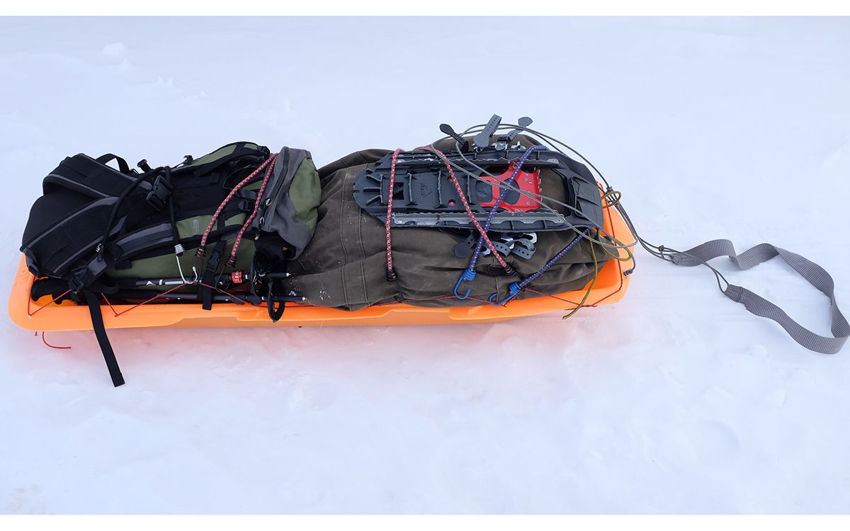 I prefer dragging my gear on a plastic sled (mine is a lightweight, hardware-store model) to carrying a backpack. I secure duffels and gym bags to the sled with bungees. Some winter travelers use rigid poles for hauling (they prevent the sled from overtaking you on hills), but my basic rope harness affords easier access to the sled when I stop for a break.