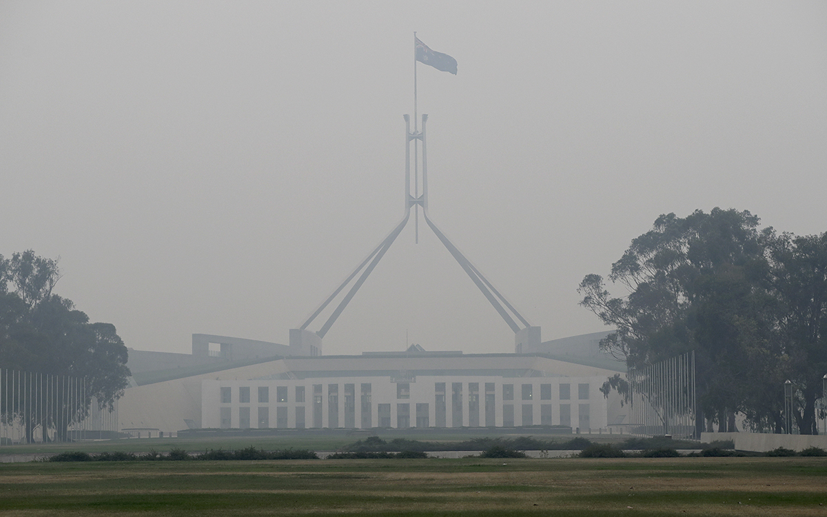 The Australian flag flies above Parliament House as smoke shrouds the Australian capital of Canberra, Australia, on January 1, 2020. | Photo by AP Photo/Mark Baker