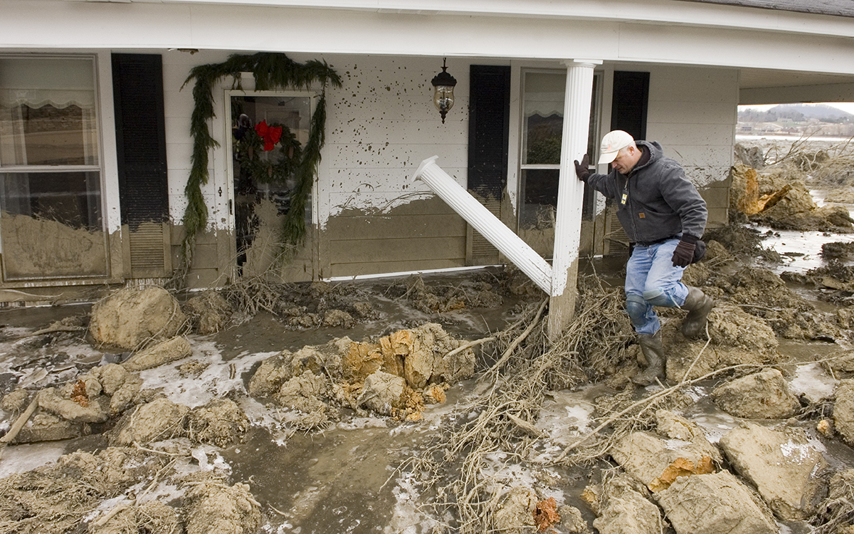 A Tennessee Valley Authority employee surveys a damaged home. | Photo by AP Photo/Knoxville News Sentinel/J. Miles Cary