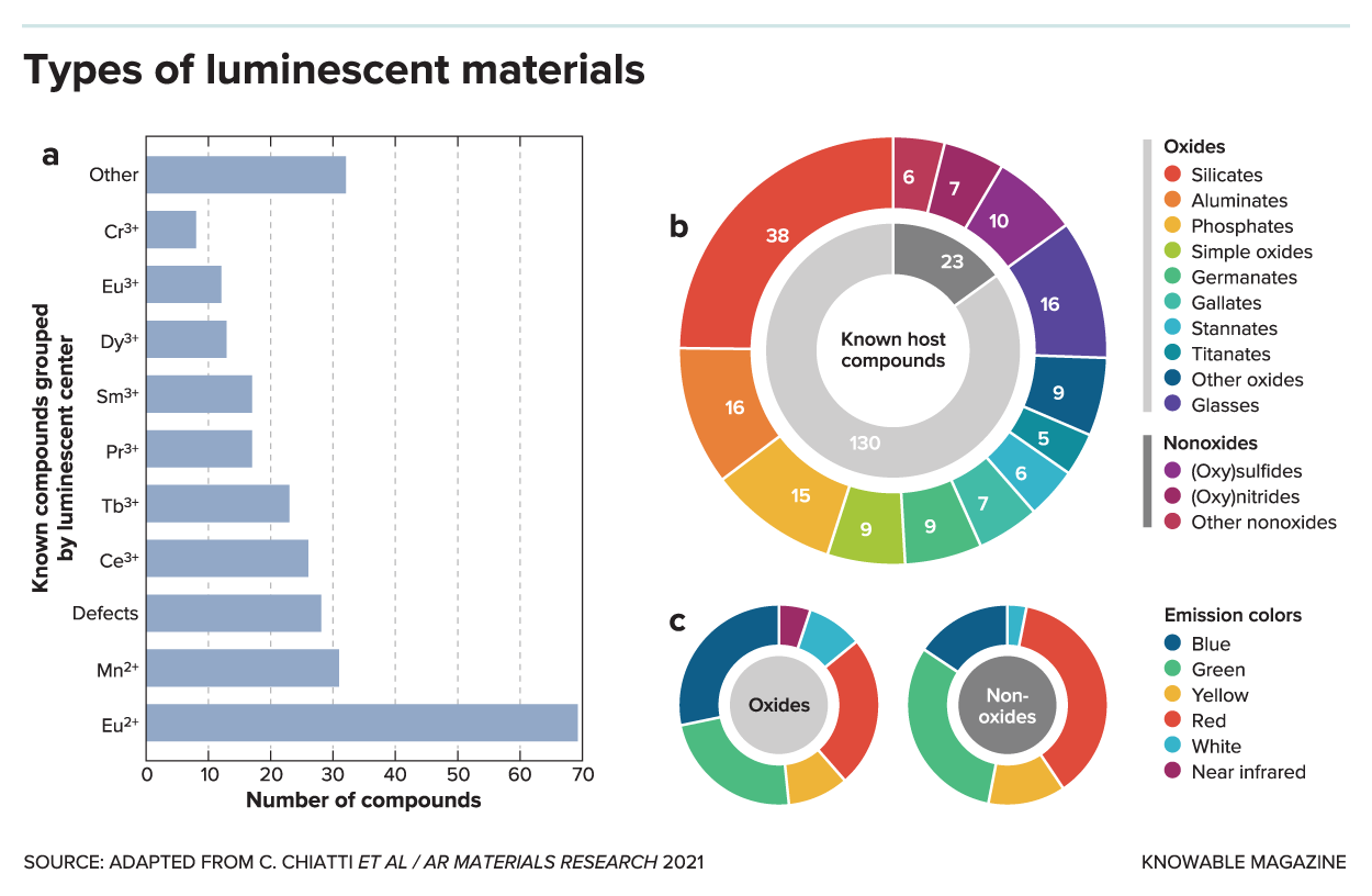 More than 250 kinds of luminescent materials have been identified. Above they are grouped by a) the trace materials that act as the luminescent center; b) the host compound; and c) the color the material emits.