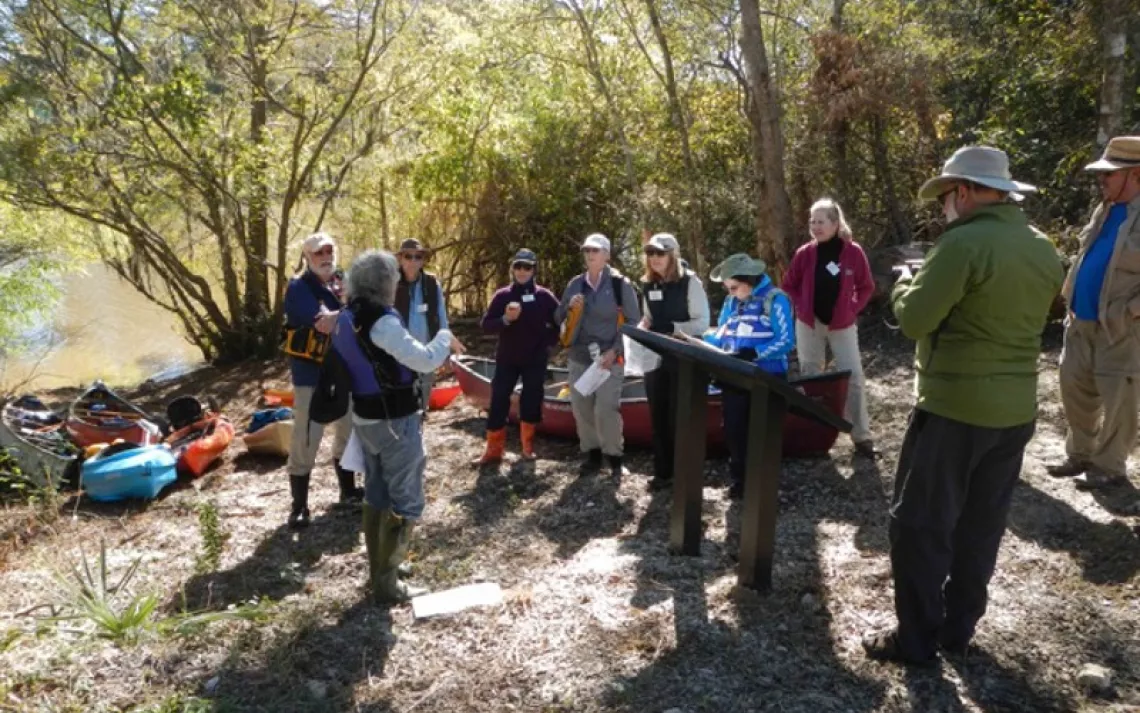 When our group of 17 paddlers headed south down Turtle Bayou from White Park, there was a pleasant breeze at our backs, and people began peeling off extra layers of now-too-warm clothing. A little over a mile down the bayou, we stopped for a hike around the Turtle Bayou Nature Preserve. Our guide for the hike was Linda Shead, who had played a significant role in establishment of the recently-opened Preserve. Next, we paddled back up to White Park for our lunch stop, a time for everyone to introduce themselves, and an opportunity for a couple of our paddlers to leave the group so that they could head out for another afternoon engagement.
