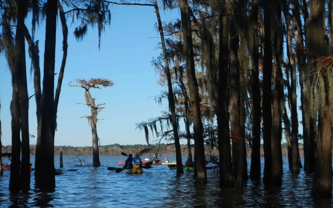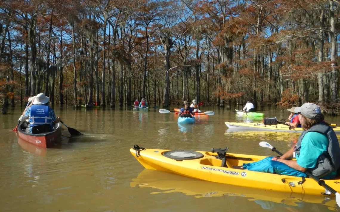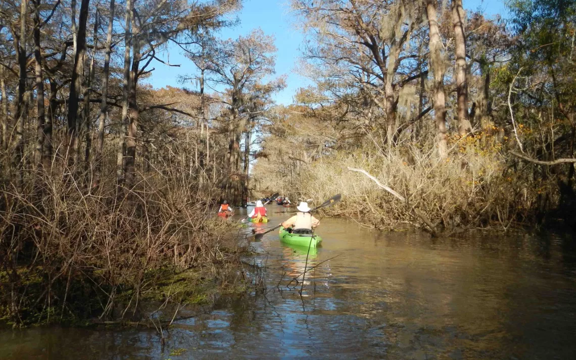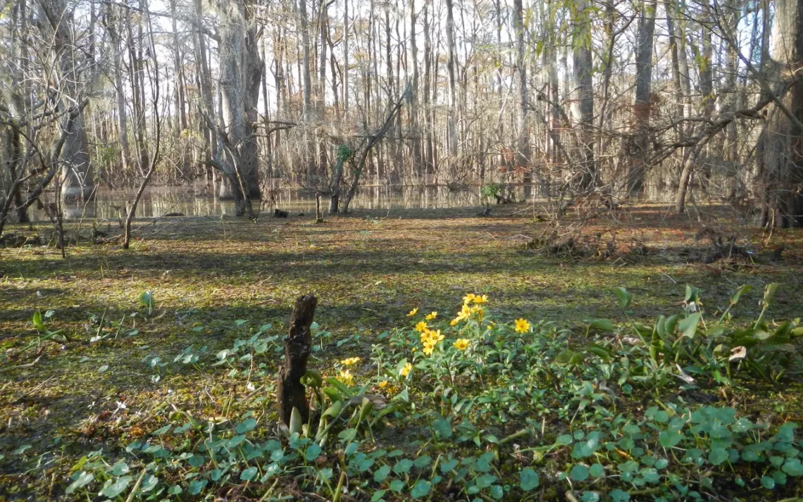 With our minds and bodies refreshed, we paddled back to Lake Miller, and up to its north end, where we followed Mud Lake Bayou for a little over a mile as it winds its way over to Mud Lake. Near the east end of the bayou, we were treated to a view of patches of Bidens laevis (common name: “smooth beggartick”), a member of the sunflower family that grows in wetlands from California to Maine.