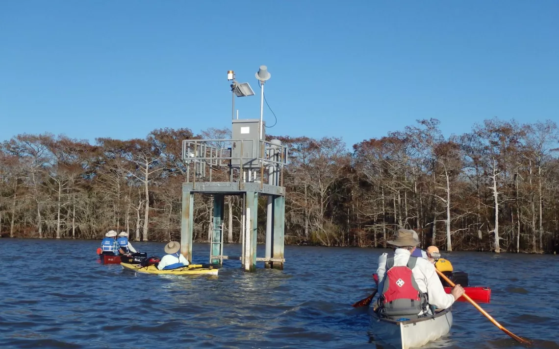 Crossing Mud Lake, we made our way north through a small channel where we caught the first view of Lake Charlotte that we had had for some time. We knew that the 1.5 mile transit across the lake back to Cedar Hill Park would be a challenge, because the variable wind from the west, that we had been artfully dodging almost all day, would again become a factor. Stopping briefly at the USGS Lake Charlotte gauging station, we completed this final leg of our journey. The launch site at Cedar Hill Park beckoned to us powerfully, as the last bit of our outing took us directly downwind to it.