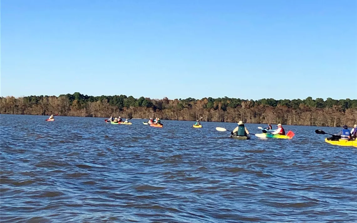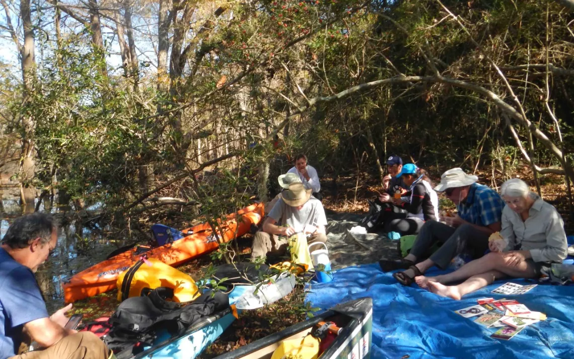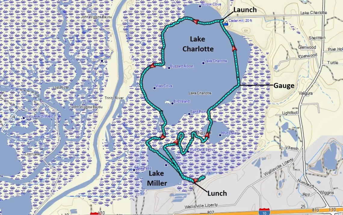 Our group of 19 paddlers headed west from Cedar Hill Park, where we had gathered, across Lake Charlotte, to the mouth of Mac Bayou. Here we could sense the strength of the current that was coming down the bayou, making it easy to see why it would not be a hospitable place to venture today. The current ushered us through a small passage known as Gator Alley, from which we went southwest and south, in and out of the forest, to Buzzard Roost. The high water let us take a shortcut through the line of trees at Buzzard Roost, then it was on down to the westernmost point of Lake Charlotte, where a large osprey nest in the top of a dead cypress tree (one of three such nests that we saw along this side of the lake) marks the point where paddlers (such as our scouting party) sometimes head west to visit a series of mysterious sand mounds that line the eastern bank of the Trinity River. Down at the south end of Lake Charlotte, we entered a stream called Lake Pass that leads down to Lake Miller. Crossing that lake, we followed a narrow corridor through the trees to our lunch stop.
