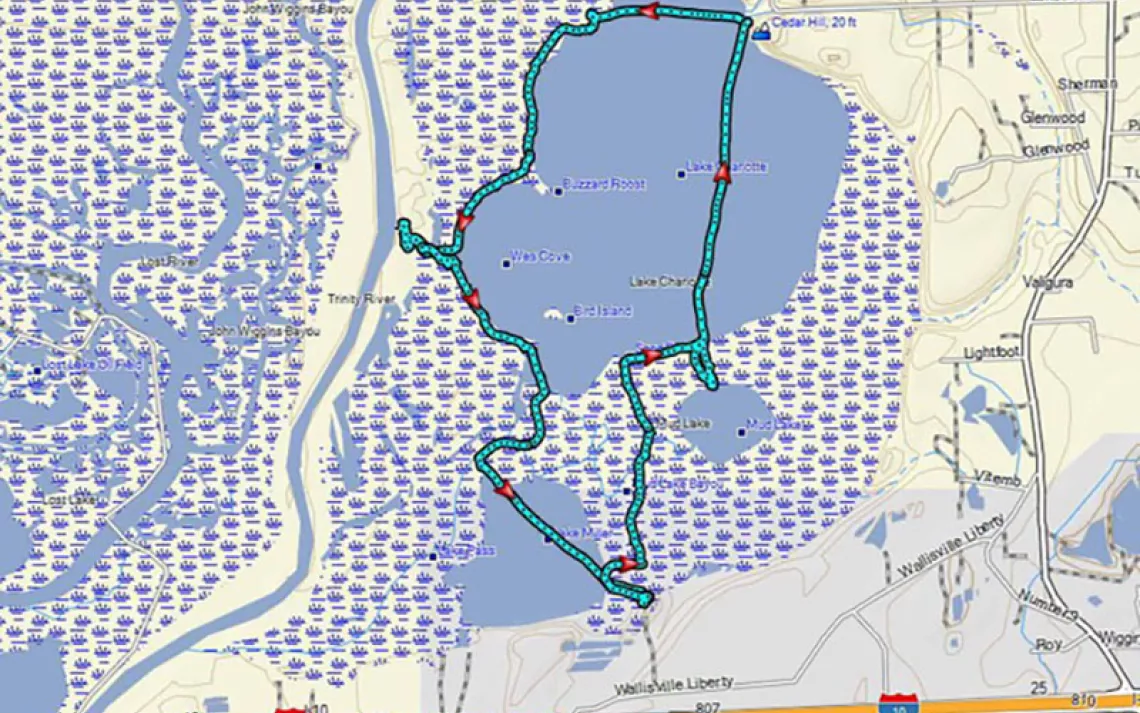 Heading back out to the edge of Lake Charlotte, we took a lunch break while we enjoyed the shade, the view, and the gentle breeze coming in across the lake. Then, it was on to the south and east, mostly through the trees, toward the shaded Lake Pass and the cut to Lake Miller. Along the way, we saw yet another osprey nest, this one being tended by both parents. Cutting across some open water, we entered a forested passage that follows an old channel of the Trinity River. On a small ridge of high ground, we stretched our legs and admired a marshy area that is surrounded by swamp.