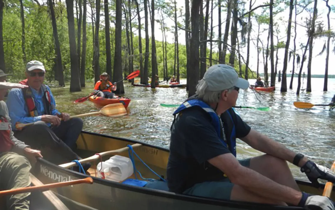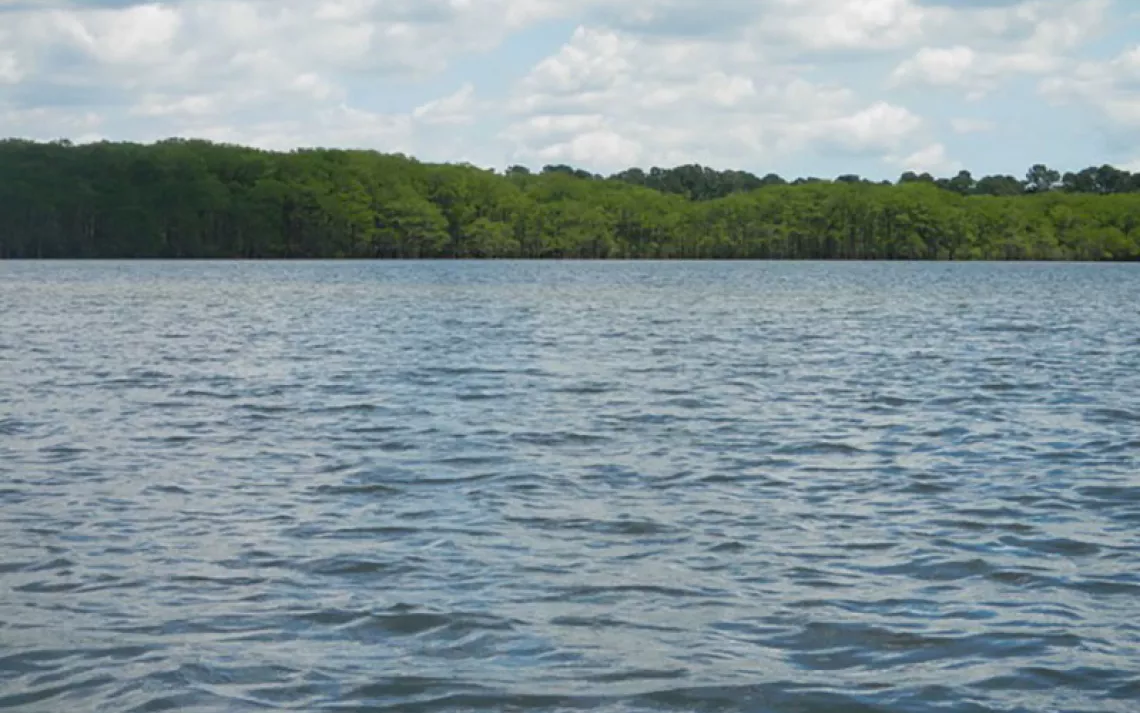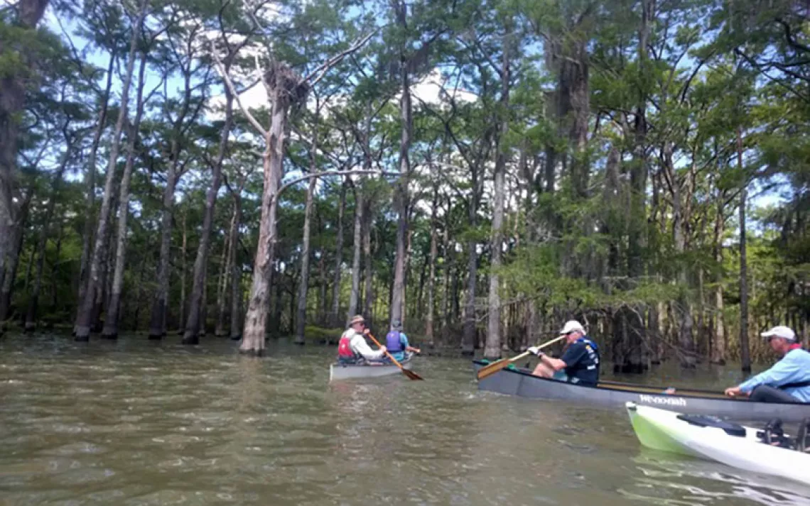 Right away, we made a run to the west across Lake Charlotte, over to the mouth of Mac Bayou. We hadn’t chosen to paddle up Mac Bayou today because of the current that we knew would be flowing down into the lake, but that same current gave us a magic carpet ride to the south through a shaded passageway and past an abandoned osprey nest. From there, we shadowed the western shore of Lake Charlotte while keeping a ways back into the forest.