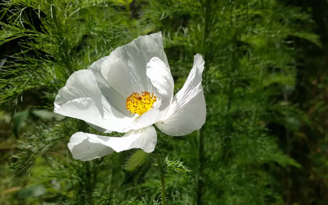 Just before we passed through the neck of high ground that extends out to Buzzard Roost, we could see numerous roseate spoonbills in the distant trees, out at the Roost. Following around the shoreline of Wes Cove, we observed a very large, inactive osprey nest that marks the place where we turned into the woods, headed for the largest of the sand mounds that dot this shore of the Trinity River. Up on the mound, lots of spring flowers were in bloom, such as coreopsis, white prickly poppy, and stemless spiderwort. Some of the mustang grape vines already bore fruit. One peculiarity here is a stand of Wright’s plantain – a plant usually associated with much drier parts of our state out to the west – reminding us that these sandy mounds are in many ways like “mini-deserts” surrounded by water.