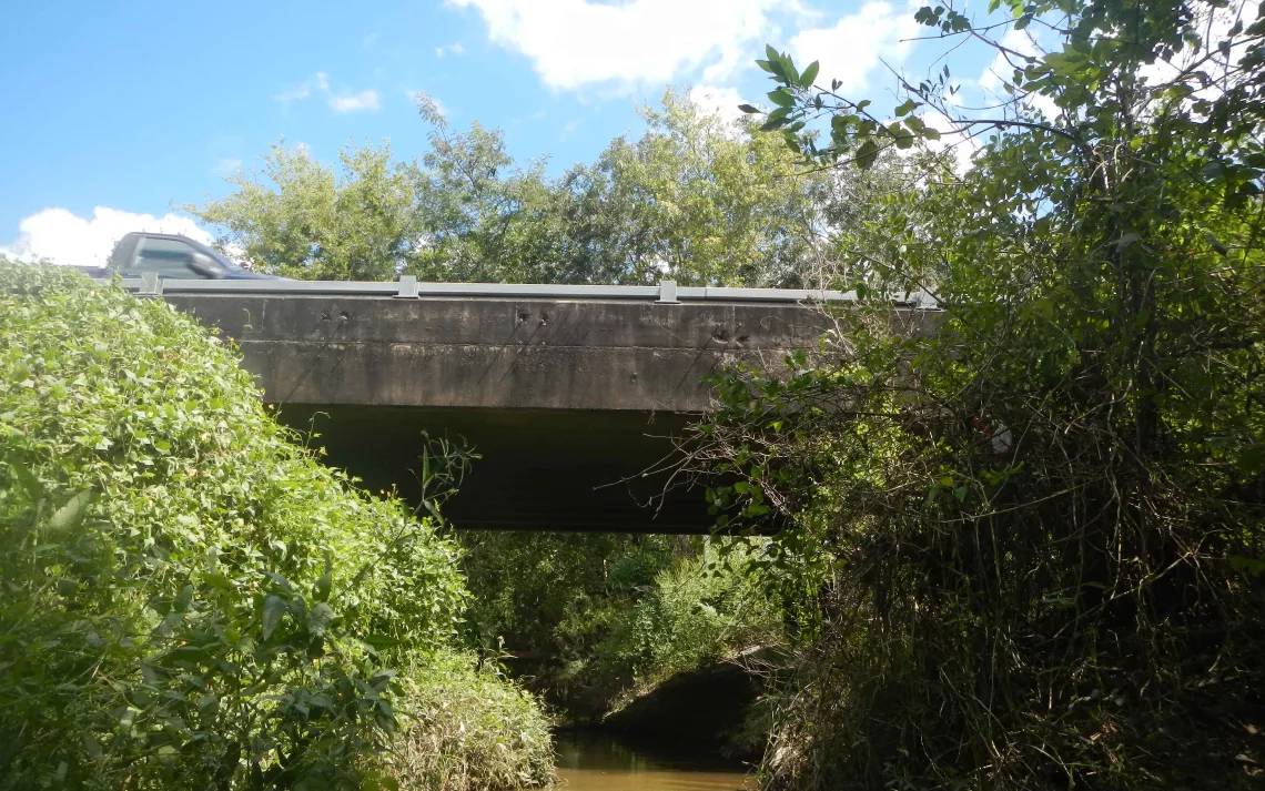 Fallen trees at mile 4.3 created the only mandatory portage on this leg of the trip. The bayou had been narrowing slowly all along, but from here on it seemed to become even more slender. Still, the depth of the channel held at around five feet. After John Rich had scouted ahead for a ways, Linda Shead and Tom Douglas decided to see whether they could make it all of the way up to Highway 562. Amazingly, they reached the bridge at mile 5.0. There, the channel was sufficiently narrow that getting the canoe turned around required lifting one end of it up onto the bank.