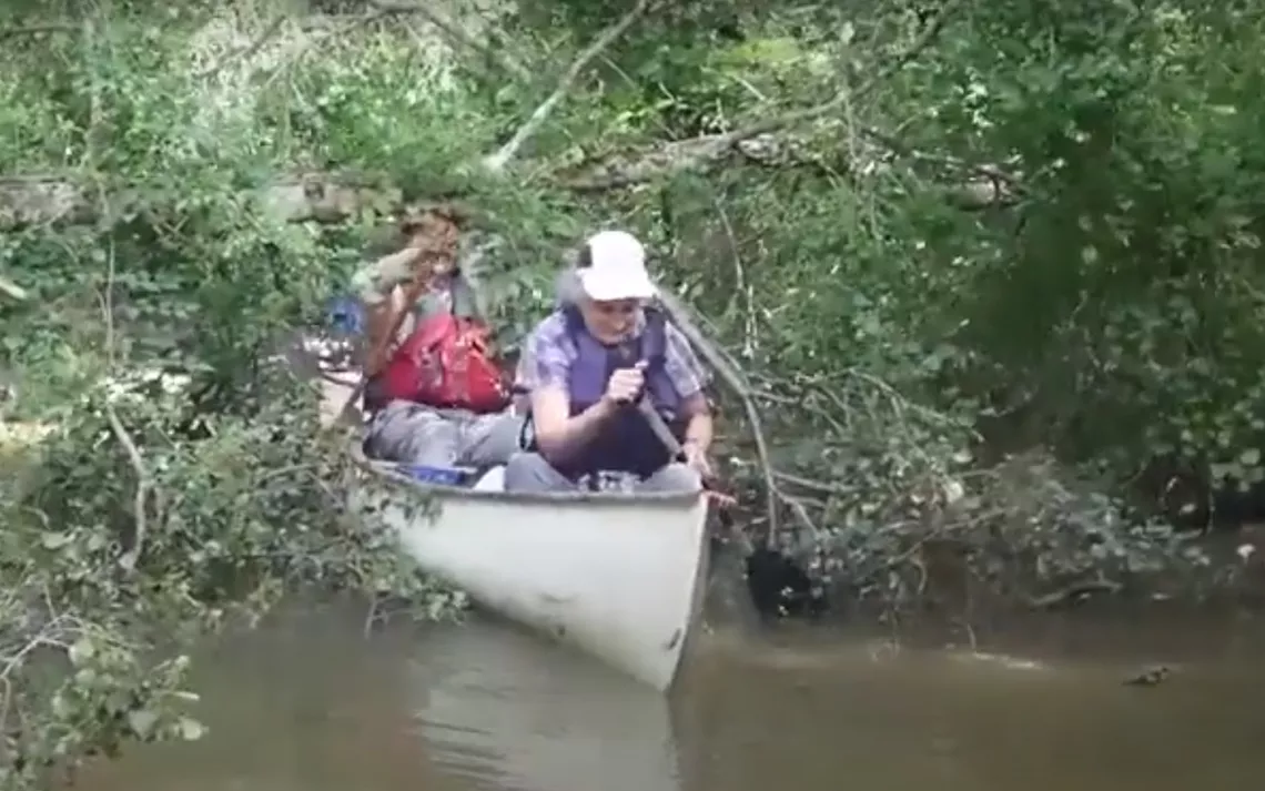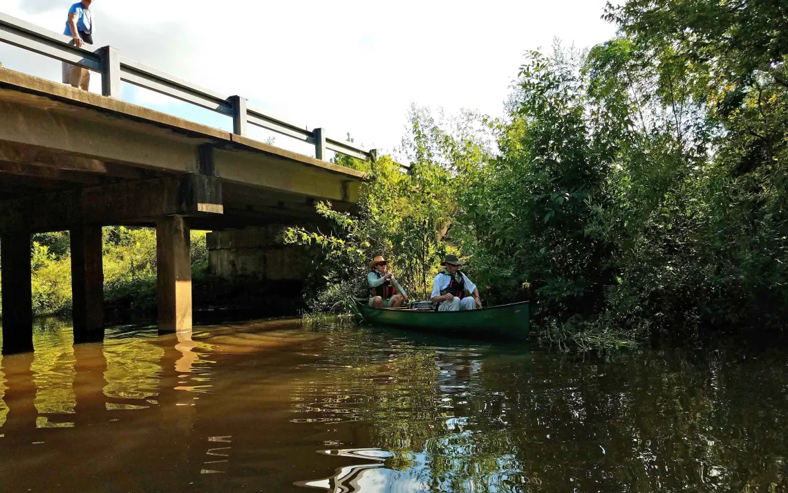 Heading back downstream, we could see that the tide was ebbing. The limbo required to get under the upper branch of the fallen tree at mile 3.3 was easier than before, but its submerged branches were now close enough to the surface to make for a tricky passage. Once again, John Rich was on hand to capture the episode on video. It had become a little easier to pass under the steel bridge, but a small fallen tree at mile 2.2 that we had nudged our way through in the morning now required a short portage. While Tyler Horne was waiting there for some of us laggards to catch up with the rest of the group, he launched a drone to catch several aerial shots of the bayou.