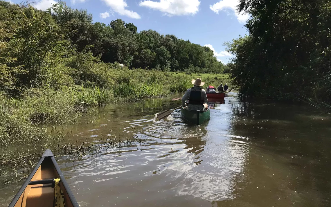 At one point, a stand of pine trees had carpeted the ground with golden needles. We negotiated several clumps of giant cutgrass (Zizaniopsis miliacea), with only one paddler experiencing a cut finger from the sharp leaf edges. Overhead, there were belted kingfishers, many golden orb weavers tending their webs, and a large flock of singing red-winged blackbirds.