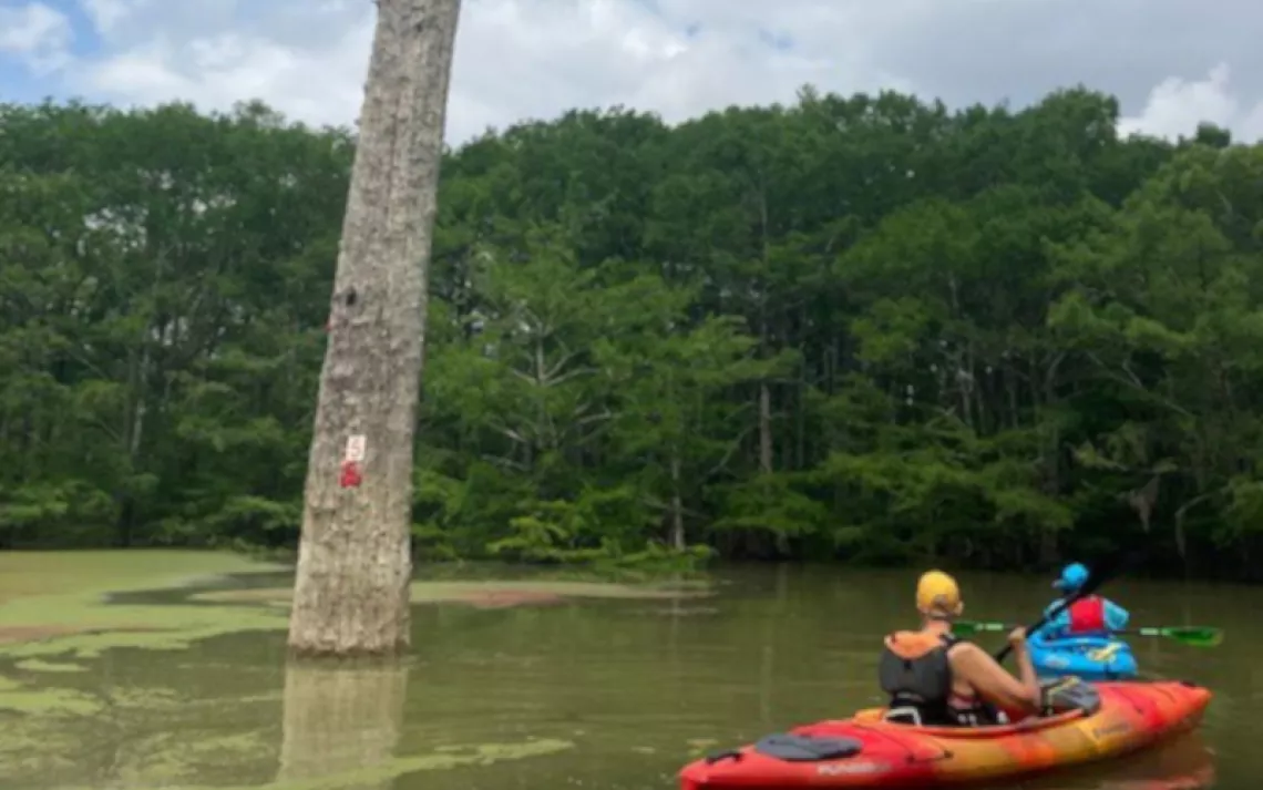 To let everyone get the hang of how the directional signs along the paddling trails are set up, we followed the markers leading to Sites #3 and #4 as we headed westward up Big Caney Creek. We enjoyed a brief and gentle rain shower that wasn’t accompanied by any thunder and helped to keep the temperature pleasant.
