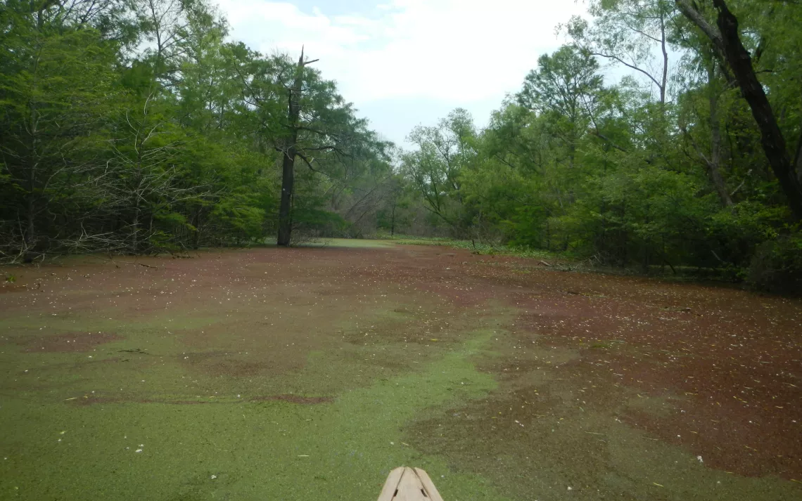We knew from Friday's scouting report that the water level would be quite high, which would give us easy access to most of the lake. Indeed, it was at 10.92 feet on the gauge at the Trinity River National Wildlife Refuge’s fishing pier adjacent to the boat ramp, up a little from what the scouts had observed two days before. Our scouts had also told us to expect a thick mat of floating azolla fern plants. Rains farther upstream in the Trinity River watershed had caused the river to rise, but not enough to reach flood stage at the Liberty gauge, which would generally trigger closure of the Champion Lake Public Use Area. Just enough water was entering the lake from the north to push that mat of azolla fern slowly to the south and east toward the spillway in the Champion Lake levee.