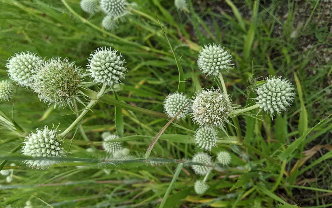 When we got to Blue Bell Prairie I did not see any Blue Bells. I did see an ocean of Rattlesnake Master along with Purple Prairie Clover, Silver Bluestem, Beebalm, Pencil Plant, Yellow Powder Puff, Brown-eyed Susan, Purple Cone Flower, Illinois Bundle Flower, Knot-root Bristle Grass, and a host of other wildflowers and native grasses.