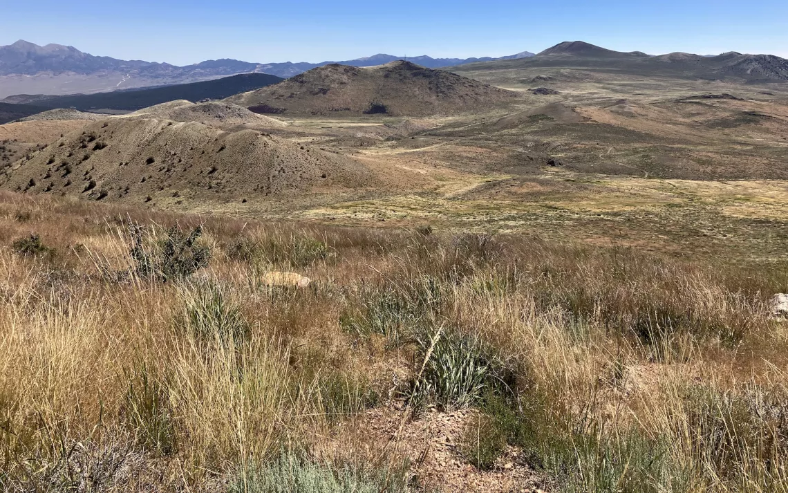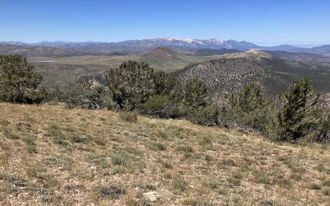 View to the north of the Dry Lakes Plateau with water in one of the ephemeral lakes at the base of Beauty Peak (the brown volcano to right of the lake) and Bald Peak (the white peak to the right of Beauty Peak). Limber pines in the foreground and the Sweetwater Mountains in the distance. Paramount Gold has been approved to drill between Bald Peak and Beauty Peak. Access will be via helicopter.